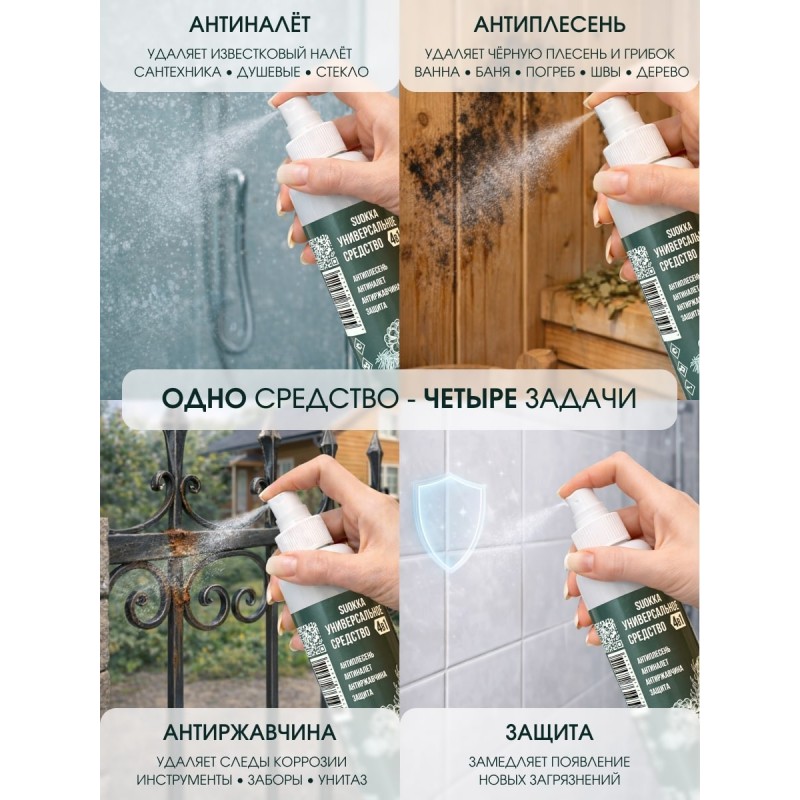 Надежная защита вашего загородного дома — без агрессивной химии! Универсальное средство SUOKKA создано для тех, кто ценит безопасность и чистоту. Эффективно удаляет плесень, известковый налет и ржавчину (в том числе в бачке унитаза) с любых поверхностей в доме, бане, гараже и на террасе. На основе натуральных компонентов, безопасно для септика и окружающей среды. Сертифицировано.