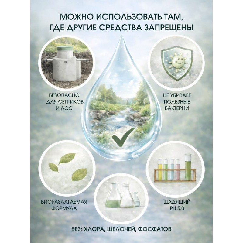 Безопасно для септиков и автономной канализации (ЛОС). Биоразлагаемая формула не вредит бактериям в вашем очистном сооружении.