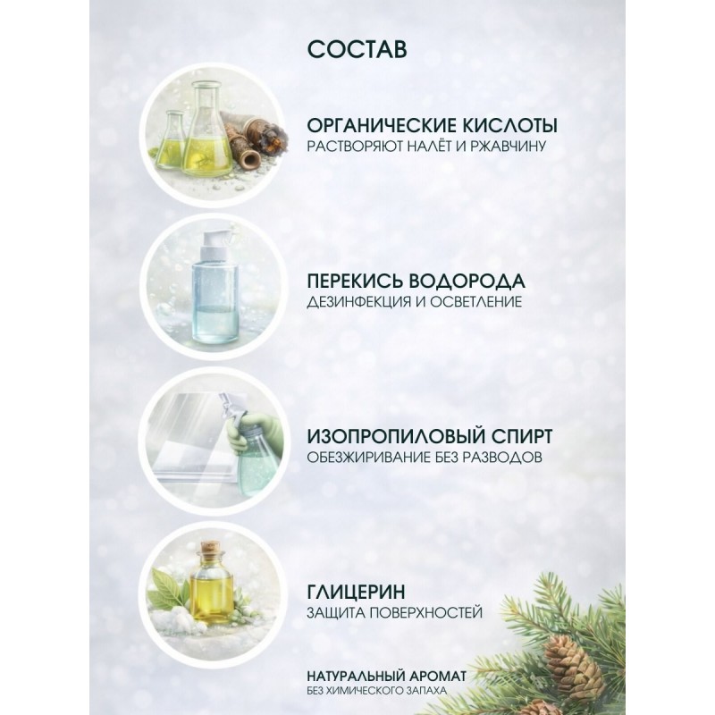 изопропиловый спирт, органические кислоты, перекись водорода, ПАВ растительного происхождения, натуральная отдушка.