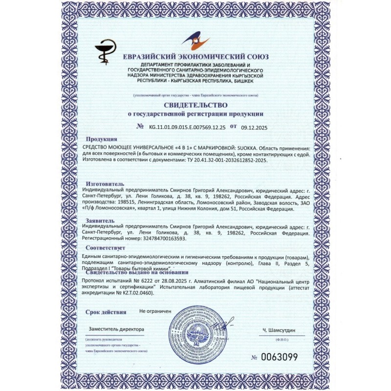 Имеет Свидетельство о госрегистрации (СГР № KG.11.01.09.015.E.007569.12.25). Полное соответствие санитарным нормам.